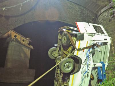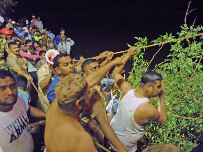 नागरिकांनी दोरी लावून गाडी घाटाकडील बाजूस ओढून धरली; कारण ती पुलावर उचलताना पुलाच्या कमानीमध्ये अडकत होती. (आदित्य वेल्हाळ)