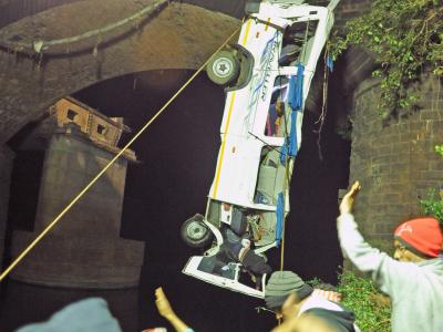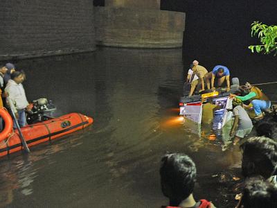 कोल्हापूर महापालिकेच्या आपत्ती व्यवस्थापन यंत्रणेच्या जवानांनी बोटीतून जाऊन गाडीतील जखमींना वाचविण्याचा प्रयत्न केला; परंतु तोपर्यंत खूप उशीर झाला होता.(आदित्य वेल्हाळ)