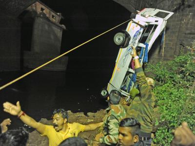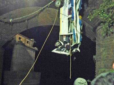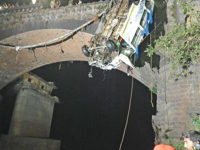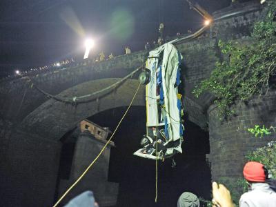 अपघातग्रस्त गाडी क्रेनने शिवाजी पुलावर आणली तेव्हाचे छायाचित्र. (आदित्य वेल्हाळ)