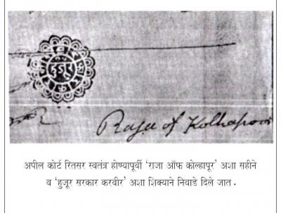 कोल्हापूर संस्थानचे अपील कोर्ट रीतसर स्वतंत्र होण्यापूर्वी राजा ऑफ कोल्हापूर अशा सहीने आणि हुजूर सरकार करवीर अशा शिक्क्याने निवाडे दिले जात होते.