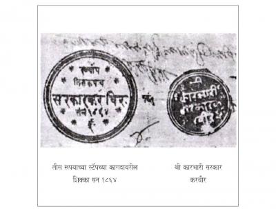 कोल्हापूर संस्थानच्या सन १८६४ मधील ३० रुपयांच्या स्टॅम्पच्या कागदावरील शिक्का आणि श्री कारभारी सरकार, करवीरचा शिक्का.