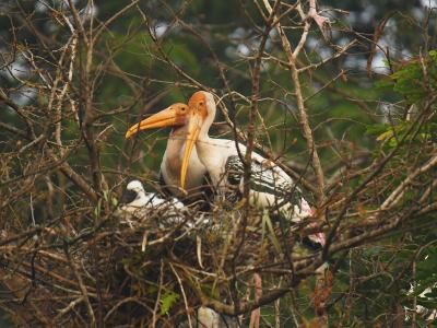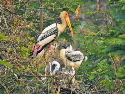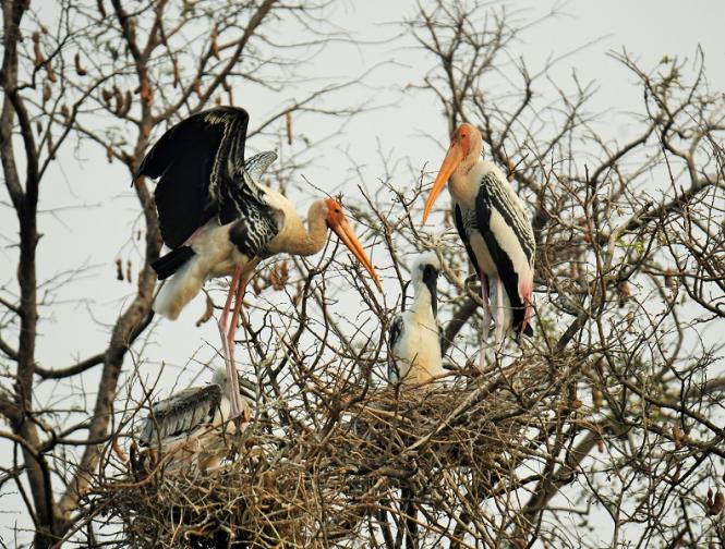 या घरट्यातील पिलाला पेंटेड स्टॉर्कची ही नर-मादी जोडी खायला घालत आहे