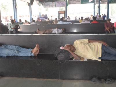 एस.टी कर्मचाऱ्यांच्या संपाच्या तिसऱ्या दिवशी आपल्या गावाकडे जाण्यासाठी कोणतेही वाहन न मिळाल्याने कोल्हापुरातील बसस्थानकामध्ये काही प्रवाशांनी अशी पथारी पसरली होती. (छाया : नसीर अत्तार)