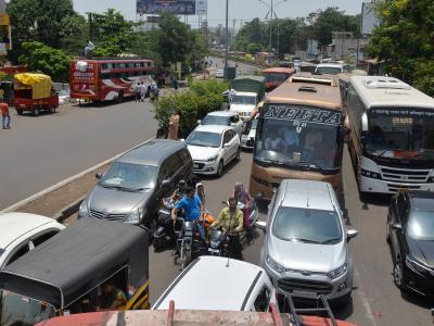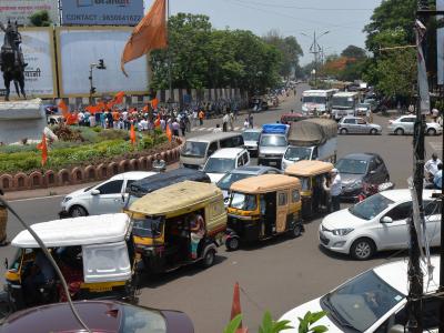 रास्ता रोको आंदोलनामुळे कावळा नाका ते मार्केट यार्ड कमानींपर्यंत वाहनांच्या अशा रांगा लागल्या होत्या. (छाया : नसीर अत्तार)