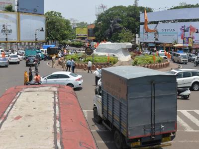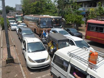 कोल्हापुरात इंधन दरवाढीविरोधात शिवसेनेने सोमवारी कावळा नाका येथे चारचाकी वाहने लावून रास्ता रोको आंदोलन केले. यामुळे चारही बाजूने वाहतूक ठप्प झाली होती.(छाया : नसीर अत्तार)