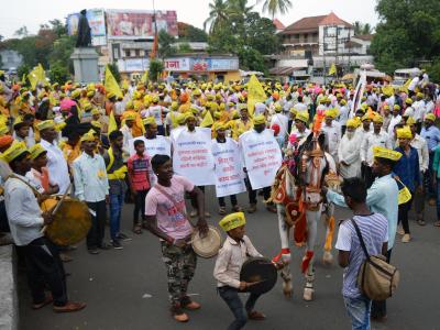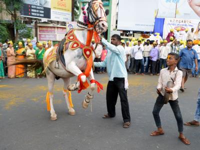 मिरवणुकीत गगनबावडा येथील गजीनृत्य, धनगरी ढोल, बेंजो अशी पारंपरिक वाद्ये, नाचणारा घोडा आणण्यात आला होता. यावेळी समाजबांधवांनी पिवळ्या टोप्या आणि फेटे परिधान केले होते. .(छाया : नसीर अत्तार)