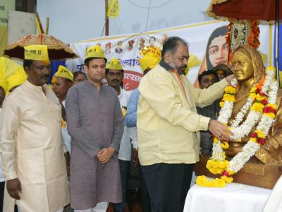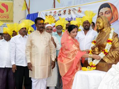 अहिल्यादेवी होळकर यांच्या पुतळ्याला शोभा बोंद्रे यांनी पुष्पहार अर्पण केला. (छाया : नसीर अत्तार)