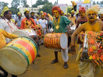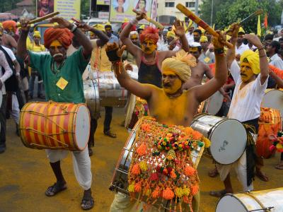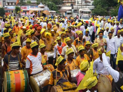 महाराष्ट्र धनगर समाज महासंघाच्या मिरवणुकीत धनगरी ढोल सर्वांचे लक्ष वेधून घेत होते. (छाया : नसीर अत्तार)