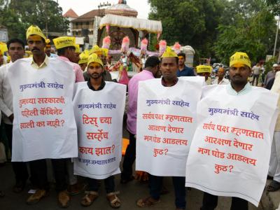 आरक्षणप्रश्नी राज्यातील सत्ताधारी सरकारविरोधातील घोषणांचे कापडी फलक धनगर समाजबांधवांनी परिधान केले होते. (छाया : नसीर अत्तार)