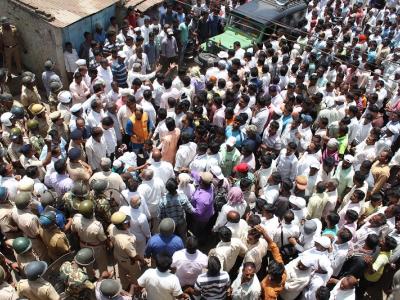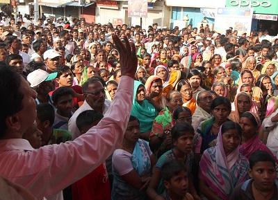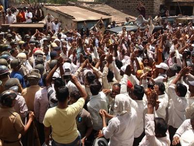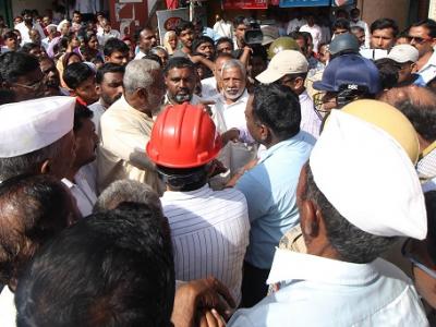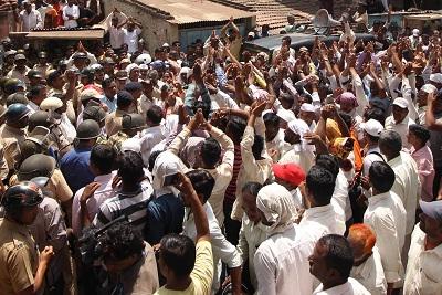 पोलीस बंदोबस्तात दानोळी येथे इचलकरंजीच्या अमृत योजनेच्या जॅकवेल बांधकामाचा प्रारंभ केला जाणार होता. त्यामुळे त्याला विरोध करण्यासाठी सकाळी आठपासून ग्रामस्थ शिवाजी चौकात थांबले होते. पोलिसांनी परत जावे म्हणून गावकर्यांनी हात जोडले . (छाया -दीपक जाधव )