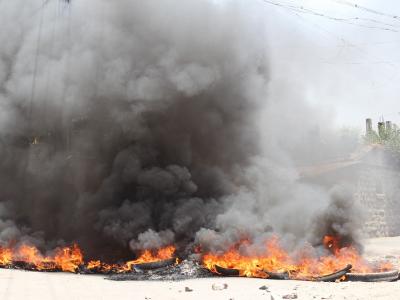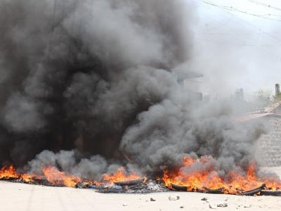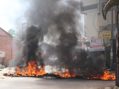 पोलीस बंदोबस्तात दानोळी येथे इचलकरंजीच्या अमृत योजनेच्या जॅकवेल बांधकामाचा प्रारंभ केला जाणार होता. त्यामुळे त्याला विरोध करण्यासाठी गावातील रस्ते टायर पेटवून अडवण्यात आले होते. (छाया -दीपक जाधव )