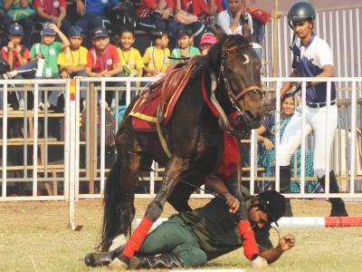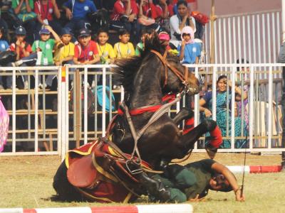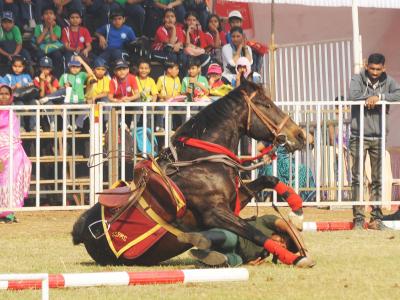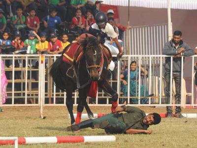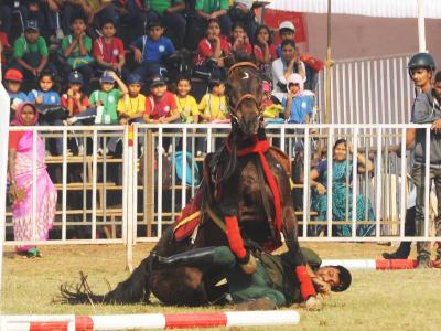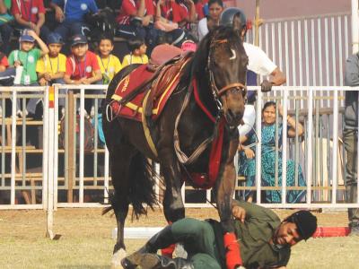 कोल्हापुरातील न्यू पॅलेस परिसरातील पोलो मैदानावर शनिवारपासून सुरू झालेल्या ‘द रॉयल कोल्हापूर हॉर्स शो’ दरम्यान एक घोडेस्वार असा पडला. ( छाया : आदित्य वेल्हाळ )