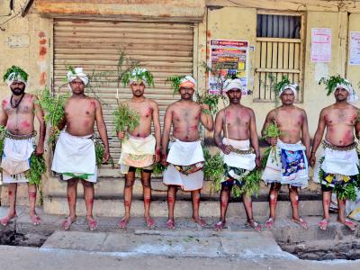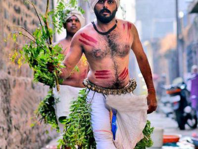 उदगाव येथे यात्रेच्या मुख्य दिवशी गावात गूळ खोबरे गोळ्या करण्यासाठी निघालेले पिशे. (छाया- अजित चौगुले, उदगांव)