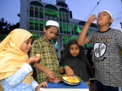 मानवतेचा व दातृत्वाचा संदेश देणाऱ्या व मुस्लिम बांधवांच्या पवित्र रमजान रोजांना शुक्रवारपासून प्रारंभ झाला. कोल्हापुरातील कसाब मस्जिद येथे लहान मुलांनी पहिला रोजा (उपवास) इफ्तार केला. (छाया : नसीर अत्तार)