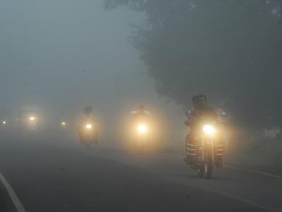 कोल्हापूरातील गुरुवारच्या पहाटे धुक्यांचे साम्राज्य होते. रत्नागिरी महामार्गावरुन शहराकडे येणाºया रस्त्यावर आंबेवाडीजवळ दुचाकीस्वारांना चक्क हेडलाईट लाउन प्रवास करावा लागला. (छाया : आदित्य वेल्हाळ)