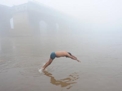 कोल्हापूरात गुरुवारी पहाटे धुक्यांचे साम्राज्य होते. या भर धुक्यातही कोल्हापूरातील तरुणांनी पंचगंगा नदीत सूर मारुन पोहोण्याचा आनंद घेतला. (छाया : आदित्य वेल्हाळ)