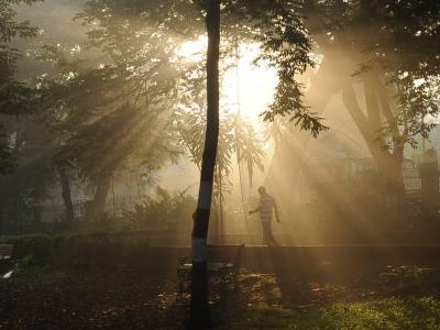 कोल्हापूरात गुरुवारच्या रम्य पहाटे जेव्हा धुक्याची दुलई पसरली होती, याचवेळी सूर्यकिरणांनी प्रवेश केला तेव्हा टाउन हॉल येथील उद्यानात आदित्य वेल्हाळ यांनी टिपलेले हे अप्रतिम छायाचित्र.