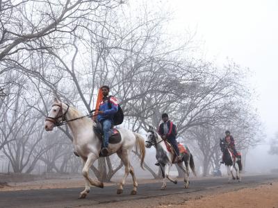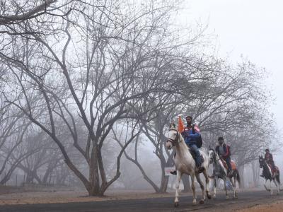 कोल्हापूरात पहाटेपासून दाट धुक्याची दुलई पहावयास मिळत आहे. दाट धुक्यातूनच न्यू पॅलेस परिसरात शाही घोडयांची रपेट सुरु होती. (छाया : आदित्य वेल्हाळ)