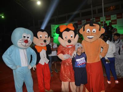 बालधावपटूंना प्रोत्साहन देण्यासाठी डेरोमन, छोटा भीम आणि मिकी माउस यांच्या वेशभूषेतील कलाकारांनी स्पर्धकांमध्ये एक वेगळीच रंगत आणली.(छाया : नसीर अत्तार, आदित्य वेल्हाळ, दिपक जाधव)