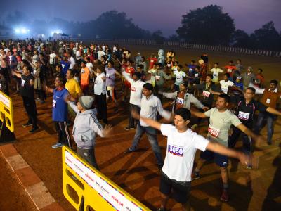 कोल्हापूर स्पोर्टस क्लबच्या धावपटूंनी प्रोमो रनमध्ये धावण्यापूर्वी असा एकत्रित सराव केला. (छाया : नसीर अत्तार, आदित्य वेल्हाळ, दिपक जाधव)
