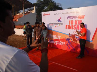 कोल्हापूरमध्ये होणाऱ्या सर्वांत मोठ्या हाफ महामॅरेथॉन स्पर्धेच्या निमित्ताने ‘लोकमत’तर्फे रविवारी आयोजित केलेल्या ‘प्रोमो-रन’मध्ये पोलीस ग्राउंड येथे सेल्फी पॉइंट उभा केला होता. या ठिकाणी सेल्फी काढण्यासाठी मोठी गर्दी होती. (छाया : नसीर अत्तार, आदित्य वेल्हाळ, दिपक जाधव)
