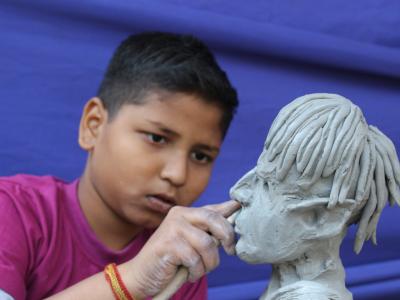 कोल्हापुरात टाउन हॉल म्युझिअम बागेत रविवारी ‘रंगबहार’च्या वतीने आयोजित रंगसुरांच्या मैफलीला बहर आला. शिल्प साकारताना लहान मुलगा. (छाया : दीपक जाधव)