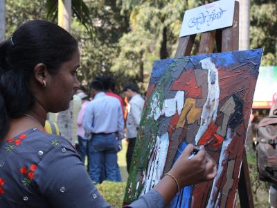 कोल्हापुरात टाउन हॉल म्युझिअम बागेत रविवारी ‘रंगबहार’च्या वतीने आयोजित रंगसुरांच्या मैफलीला बहर आला. चित्र साकारताना चित्रकार. (छाया : दीपक जाधव)