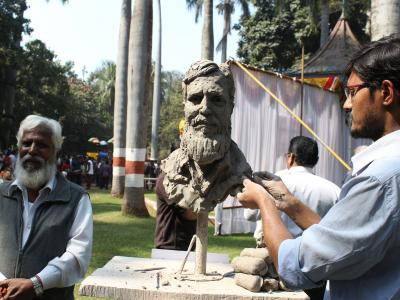 कोल्हापुरात टाउन हॉल म्युझिअम बागेत रविवारी ‘रंगबहार’च्या वतीने आयोजित रंगसुरांच्या मैफलीला बहर आला. व्यक्तिशिल्प साकारताना शिल्पकार. (छाया : दीपक जाधव)