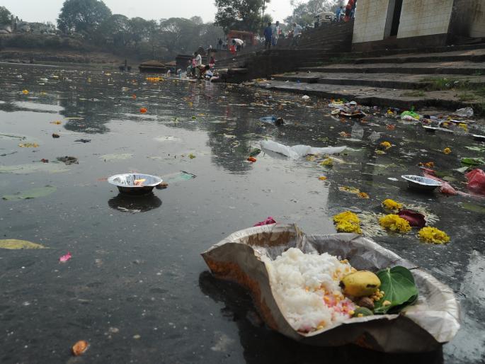 1 / 4जे देवाला वाहिलेले असते ते टाकायचे कुठे म्हणून नदीत सोडण्याची पारंपारिक मानसिकता आहे. परंतू ही मानसिकता नदीच्या जीवावर उठत आहे. पंचगंगा प्रदूषणाचा विषय राज्य सरकारपासून सर्वोच्च न्यायालयापर्यंत गेला आहे. सरकार आदेश काढते, न्यायालय फटकारे देते तरीही प्रदूषण कांही कमी व्हायला तयार नाही आणि लोकांची मानसकिताही बदलत नाही. 2 / 4जे देवाला वाहिलेले असते ते टाकायचे कुठे म्हणून नदीत सोडण्याची पारंपारिक मानसिकता आहे. परंतू ही मानसिकता नदीच्या जीवावर उठत आहे. पंचगंगा प्रदूषणाचा विषय राज्य सरकारपासून सर्वोच्च न्यायालयापर्यंत गेला आहे. सरकार आदेश काढते, न्यायालय फटकारे देते तरीही प्रदूषण कांही कमी व्हायला तयार नाही आणि लोकांची मानसकिताही बदलत नाही. 3 / 4कोल्हापूरची जीवनदायिनी असलेल्या पंचगंगा नदीचे हे अत्यंत ओंगळवाणे दृश्य बुधवारी सकाळी पाहायला मिळाले. मंगळवारी अमावस्या होती. त्यामुळे त्यानिमित्त नदीला नैवेद्य सोडण्याची प्रथा अनेक वर्षापासून सुरु आहे. त्यामुळे पत्रावळी, दहीभात,बेल-फुले सगळेच नदीत सोडतात. त्यामुळे नदी अशी गटार बनून जाते. (छायाचित्रे : आदित्य वेल्हाळ)4 / 4जे देवाला वाहिलेले असते ते टाकायचे कुठे म्हणून नदीत सोडण्याची पारंपारिक मानसिकता आहे. परंतू ही मानसिकता नदीच्या जीवावर उठत आहे. पंचगंगा प्रदूषणाचा विषय राज्य सरकारपासून सर्वोच्च न्यायालयापर्यंत गेला आहे. सरकार आदेश काढते, न्यायालय फटकारे देते तरीही प्रदूषण कांही कमी व्हायला तयार नाही आणि लोकांची मानसकिताही बदलत नाही.