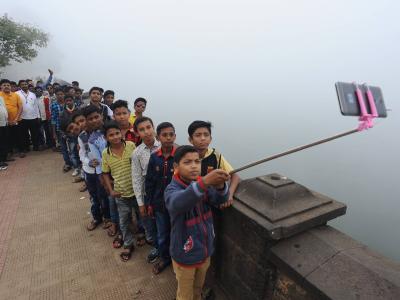 रंकाळा तलाव येथे धुक्यात हरविलेल्या तलावासह आपलीही छबी मोबाईलमध्ये सेल्फीद्वारे घेण्याचा मोह सहलीसाठी आलेल्या विद्यार्थ्यांना आवरता आला नाही. यात शिक्षकांसह विद्यार्थीही असे सहभागी झाले होते./छाया : आदित्य वेल्हाळ