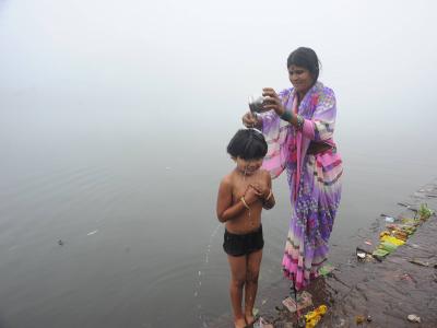 कोल्हापुरातील पंचगंगा नदीकाठी मंगळवारी सकाळी दाट धुके व कडाक्याच्या थंडीत पर्यटनासाठी आलेल्या छकुलीनेही नदीच्या पाण्यात स्नान केले./छाया : आदित्य वेल्हाळ