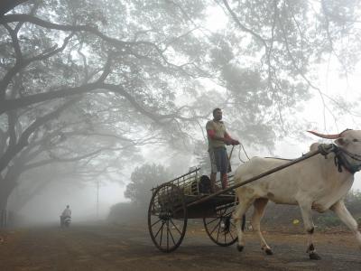 कोल्हापुरातील पंचगंगा नदीकाठच्या रस्त्यावरून मंगळवारी सकाळी धुक्यातून वाट काढीत जाणारी बैलगाडी./छाया : आदित्य वेल्हाळ