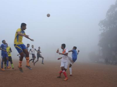 कोल्हापुरातील महाराष्ट्र हायस्कूलच्या परिसरात धुक्यातही फुटबॉल खेळण्याचा आनंद घेणारी मुले. /छाया : आदित्य वेल्हाळ