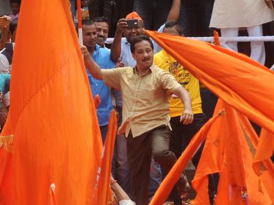 कोल्हापुरातील ऐतिहासिक दसरा चौकात गुरुवारी सकल मराठा क्रांती ठोक मोर्चातर्फे आयोजित जाहीर एल्गार सभेनंतर आमदार चंद्रदीप नरके यांनी मराठी गाण्यावर असा ठेका धरला. (छाया : आदित्य वेल्हाळ)