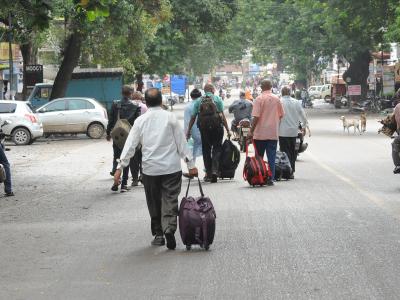 मराठा आरक्षणाच्या मागणीसाठी गुरुवारी सकल मराठा क्रांती ठोक मोर्चातर्फे पुकारण्यात आलेल्या बंदमुळे सार्वजनिक वाहतूक बंद राहिल्याने प्रवाशांना अशी पायपीट करावी लागली. (छाया : आदित्य वेल्हाळ)