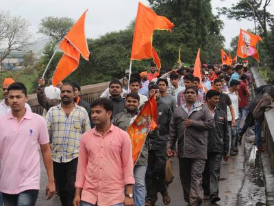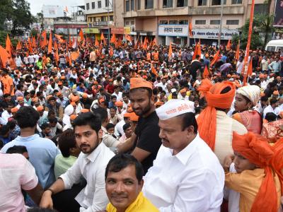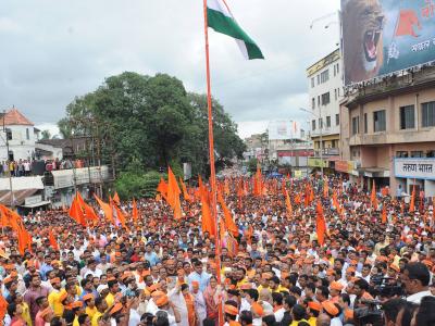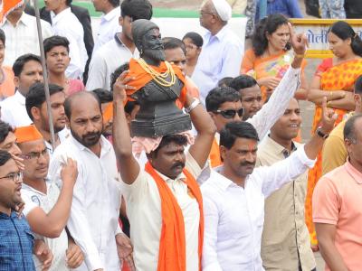 कोल्हापुरातील ऐतिहासिक दसरा चौकात गुरुवारी सकल मराठा क्रांती ठोक मोर्चातर्फे आयोजित जाहीर एल्गार सभेसाठी वडणगे (ता. करवीर) येथील मराठा बांधवांनी शिवछत्रपतींची मूर्ती डोक्यावरून घेऊन येत उत्स्फूर्त सहभाग नोंदविला.(छाया : आदित्य वेल्हाळ)