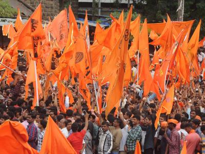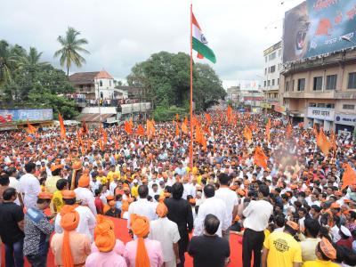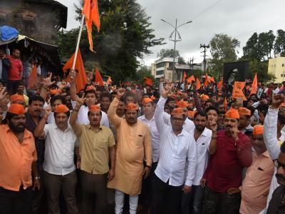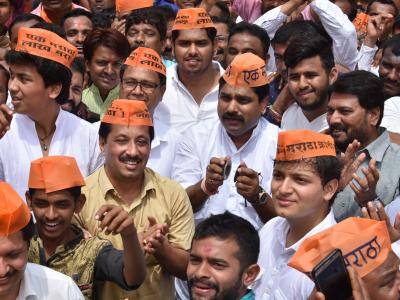 कोल्हापुरातील ऐतिहासिक दसरा चौकात गुरुवारी सकल मराठा क्रांती ठोक मोर्चातर्फे आयोजित जाहीर एल्गार सभेवेळी मराठा तरुणांनी हातातील भगवे झेंडे उंचावून असा जल्लोष केला. (छाया : आदित्य वेल्हाळ)