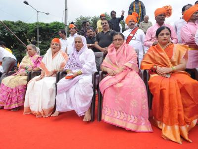 कोल्हापुरातील ऐतिहासिक दसरा चौकात गुरुवारी सकल मराठा क्रांती ठोक मोर्चातर्फे आयोजित जाहीर एल्गार सभेला महापौर शोभा बोंद्रे यांच्यासह वीर माता उपस्थित होत्या. (छाया : आदित्य वेल्हाळ)