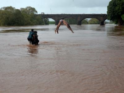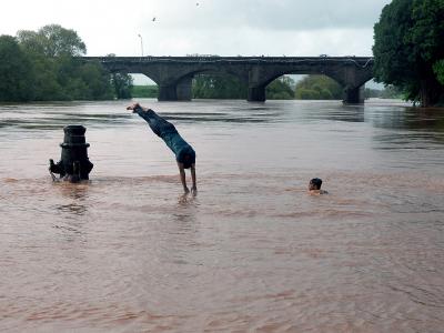 गेले दोन दिवस जिल्ह्यात जोरदार पाऊस सुरू असल्याने नद्यांचे पाणी पात्राबाहेर पडले आहे. या पाण्यात मुलांनी सूर मारत पोहण्याचा आनंद घेतला. (छाया : नासिर अत्तार)