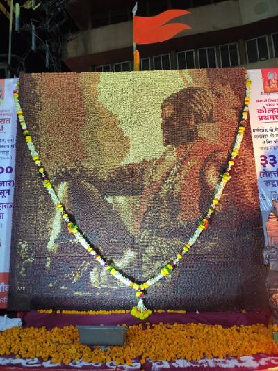 तेहतीस हजार रुद्राक्षांपासून साकारली शिवप्रतिमा छत्रपती शिवाजी महाराज यांच्या जयंतीनिमित्त अतुल माने यांच्या संकल्पनेतून व चेतन राऊत (मुंबई ) यांच्या मार्गदर्शनाखाली ३३ हजार रुद्राक्षांपासून छत्रपती शिवाजी महाराज यांची प्रतिमा साकारली. तिचे अनावरण मधुरिमाराजे यांच्या हस्ते बुधवारी सायंकाळी झाले. (छाया : आदित्य वेल्हाळ)