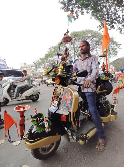 चक्क स्कूटरवर अवतरली शिवशाही कोल्हापुरातील यादवनगरात राहणारे शिवभक्त राजू पाटील यांनी आपल्या जुन्या स्कूटरवर शिवजयंतीनिमित्त छत्रपती शिवरायांचा छोटा पुतळा, गडकिल्ल्यांची प्रतिकृती, जिजाऊ, शिवराय आणि बाल संभाजी, अशी चित्रे रंगवली आहेत. त्यांची ही स्कूटर बालचमूसह थोरमोठ्यांचे आकर्षण ठरत आहे. (छाया : आदित्य वेल्हाळ)