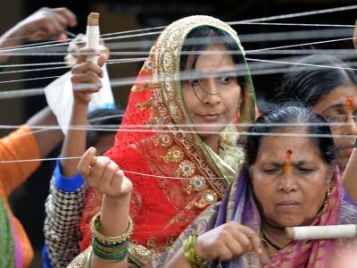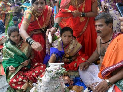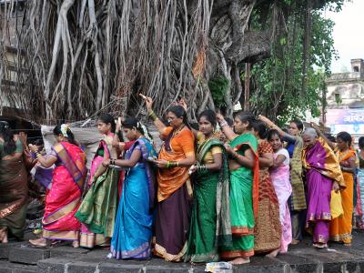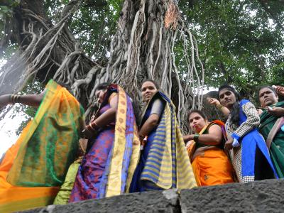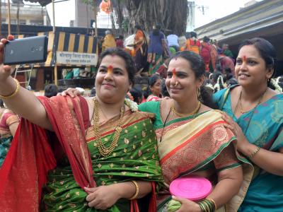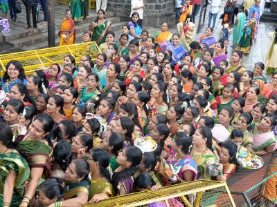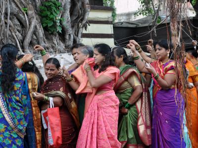 बुधवारी पावसानेही विश्रांती घेतल्याने महिला भरजरी काठापदराच्या साड्या,सौभाग्यालंकार असलेल्या मंगळसुत्रासह दागिने, केसात गजरा असा साजश्रूंगार करून परिसरातील वड पूजनासाठी बाहेर पडल्या. .(छाया : नसीर अत्तार)