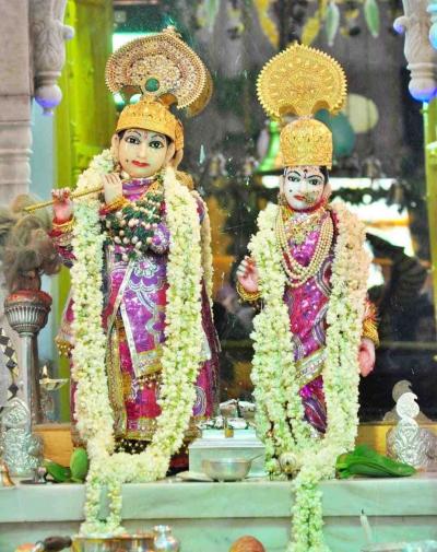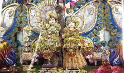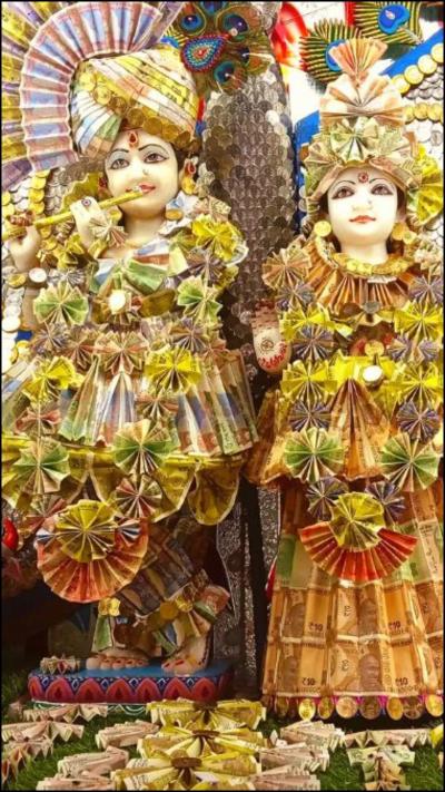 मंदिरातील मूर्तींना या दागिन्यांनी सजवल्यानंतर राधा-कृष्णाचं हे मनमोहक रुप पाहायला अनेक भाविक गर्दी करतात. श्रीकृष्णाच्या हाती सोन्याची बासरी आहे.