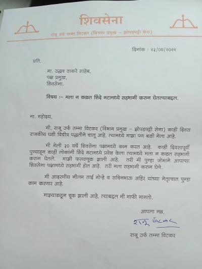 परंतु शिंदे गटातून पुन्हा मूळ शिवसेनेत परत येणारे राजू विटकर हे पहिले शिवसैनिक ठरले आहेत. पक्षप्रमुख उद्धव ठाकरे यांची माफी मागत त्यांनी पुन्हा पक्षात जोमाने काम करू असं वचन विटकर यांनी पत्राद्वारे केले आहे.