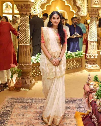 राधिकाने पांढऱ्या रंगाची गुजराती साडी नेसून पारंपरिक लूक केला होता. या पारंपरिक आणि साध्या लूकमध्येही तिचं सौंदर्य अधिकच खुलून आलं होतं.