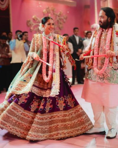 गरबा नाईटसाठी खास जांभळ्या रंगाच्या भरजरी लेहेंग्यात राधिका दिसली. तर अनंत अंबानीने गुलाबी रंगाचा डिझायनर कुर्ता परिधान केला होता.