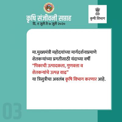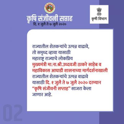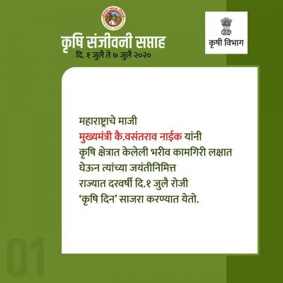 महाराष्ट्राचा शेतकरी सक्षम आणि स्वयंपूर्ण झाला पाहिजे असे स्वप्न महाराष्ट्राचे माजी मुख्यमंत्री आणि हरित क्रांतीचे प्रणेते स्वर्गीय वसंतराव नाईक यांनी पाहिले होते. त्यासाठी, राज्य सरकारने 1 जुलै ते 7 जुलै या कालावधीत कृषी संजीवनी सप्ताह आयोजित केला आहे.