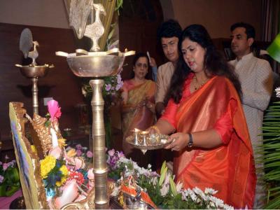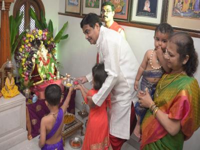 पंकजा मुंडे यांच्या मुंबईतल्या घरी गणपतीची प्रतिष्ठापना करण्यात आली. मुंडे यांचे पती, मुलं, आई, बहीण यावेळी उपस्थित होते. पंकजा मुंडे यांच्या घरी पाच दिवस गणपती असतो.