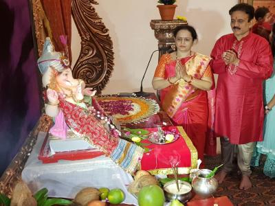 राज्याचे जलसंपदामंत्री गिरीश महाजन यांनी मुंबई येथील निवासस्थानी श्रीं ची स्थापना केली. सोबत त्यांच्या पत्नी व जामनेरच्या नगराध्यक्षा साधना महाजन.