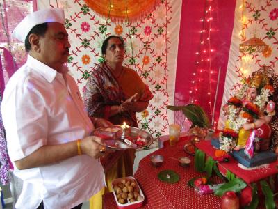 कोथळी ता.मुक्ताईनगर (जि. जळगाव) येथे आपल्या निवासस्थानी गणरायाची स्थापनेप्रसंगी राज्याचे माजी महसूल मंत्री एकनाथराव खडसे.सोबत त्यांच्या पत्नी आणि महानंदच्या अध्यक्षा मंदाकिनी खडसे. शेतकरी कर्जमुक्त होवो अशी प्रार्थना त्यांनी गणरायाला केली.